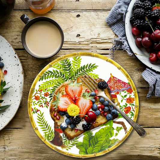 Découvrez notre service d'assiettes en mélamine de la collection de vaisselle MelARTmine. Qu'elle soit plate ou creuse, votre assiette en mélamine ronde saura mettre en valeur vos tables d'intérieur ou d'extérieur et ainsi éblouir vos convives. Nos assiettes mélamine sont parfaites pour une utilisation quotidienne mais aussi pour les jours de fête ! Leurs avantages ? Elles sont en mélamine pure, elles résistent donc aux chocs, sont légères, passent au lave-vaisselle et gardent leur éclat au fil du temps ! Choisissez une assiette en mélamine parmi plusieurs thèmes colorés : Toucans de Rio, Jungle, Singes de Bali, Lisbonne, Fleurs Exotiques... Il ne vous reste plus qu'à faire le dressage !