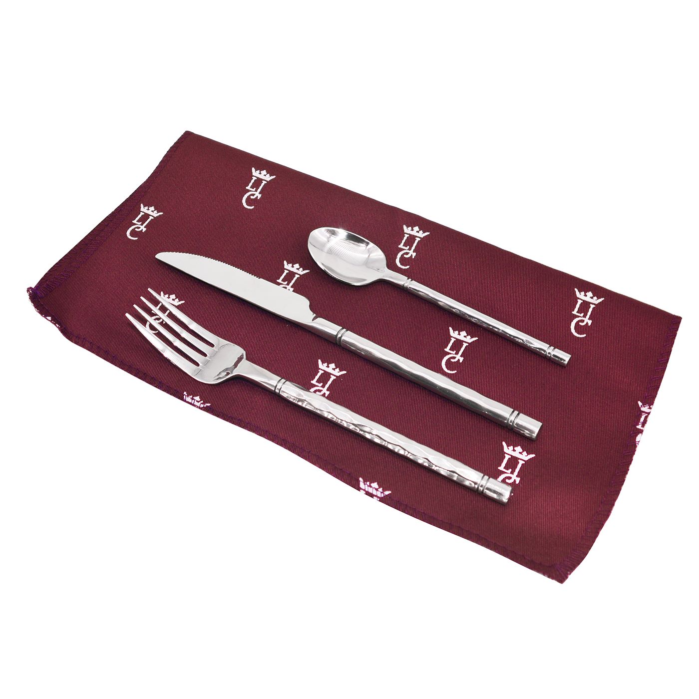 - 2 jeux complets de couverts design en acier inoxydable comprenant 2 couteaux, 2 fourchettes et 2 cuillères à café maintenus par des sangles en croûte de cuir surpiqué.