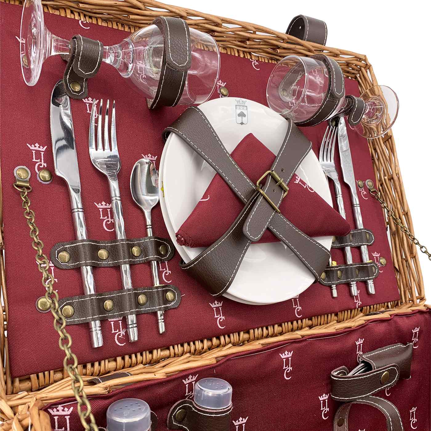 Malle pique-nique osier et cuir bordeaux - 2 personnes