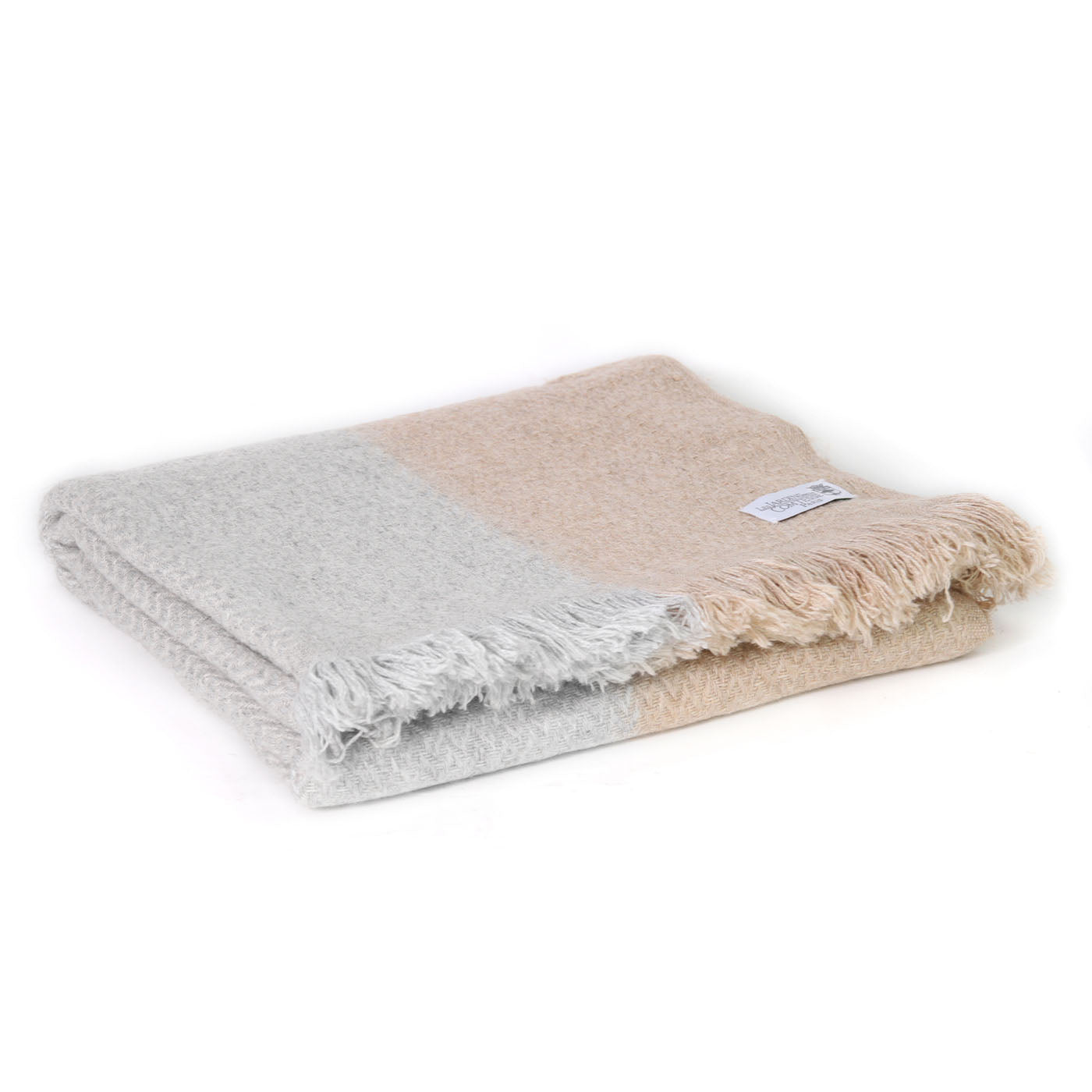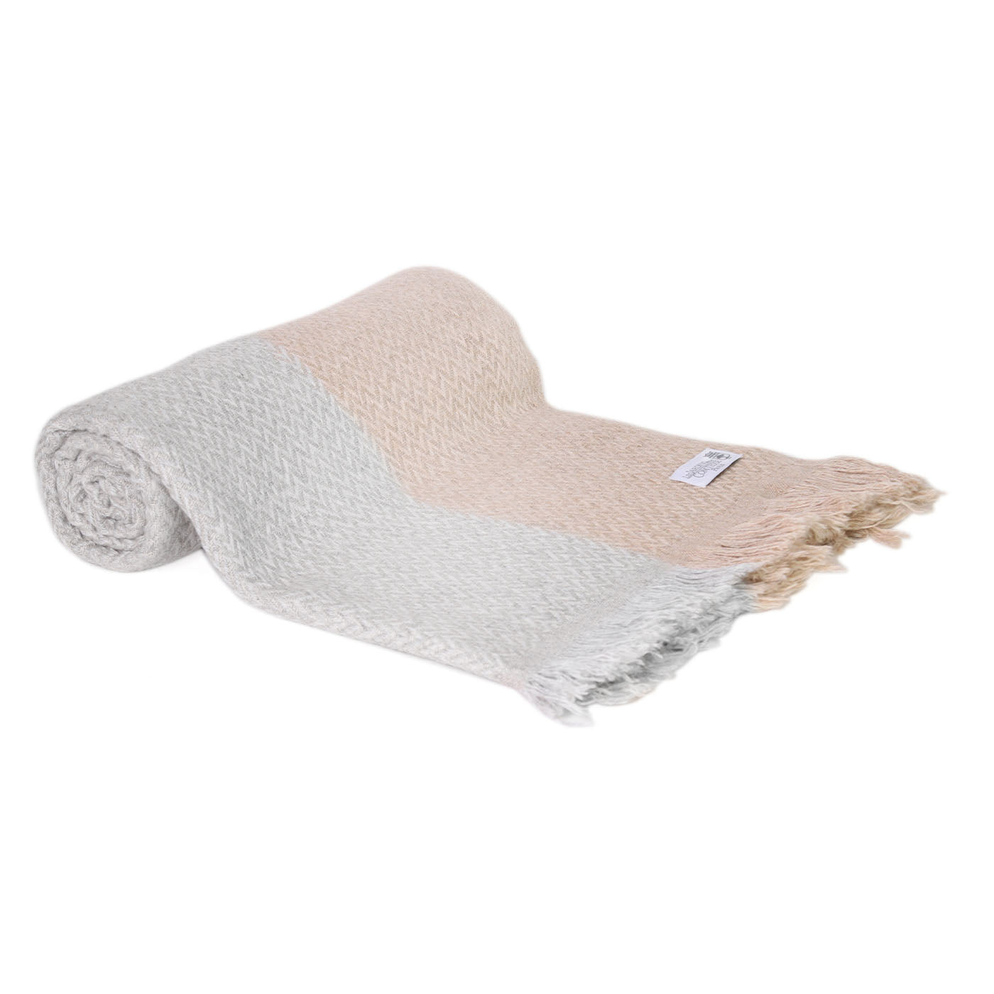 Plaid cachemire et laine à bandes Gris Argenté / Camel - Petits chevrons - 130 x 230 cm